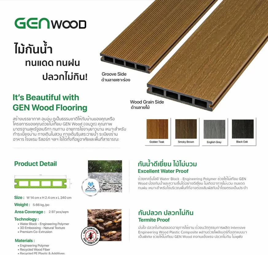 ด้วยไม้เทียม WPC คุณภาพสูงมาตรฐานยุโรป นำไปสู่การตกแต่งพื้นที่ภายนอก และภายในอาคารอย่างลงตัว กลมกลืนกับธรรมชาติขั้นสูงสุด มีวัสดุให้เลือกหลากหลายแบบ ไม่ว่าจะเป็น งานพื้น หรือผนัง เช่น